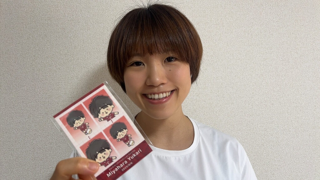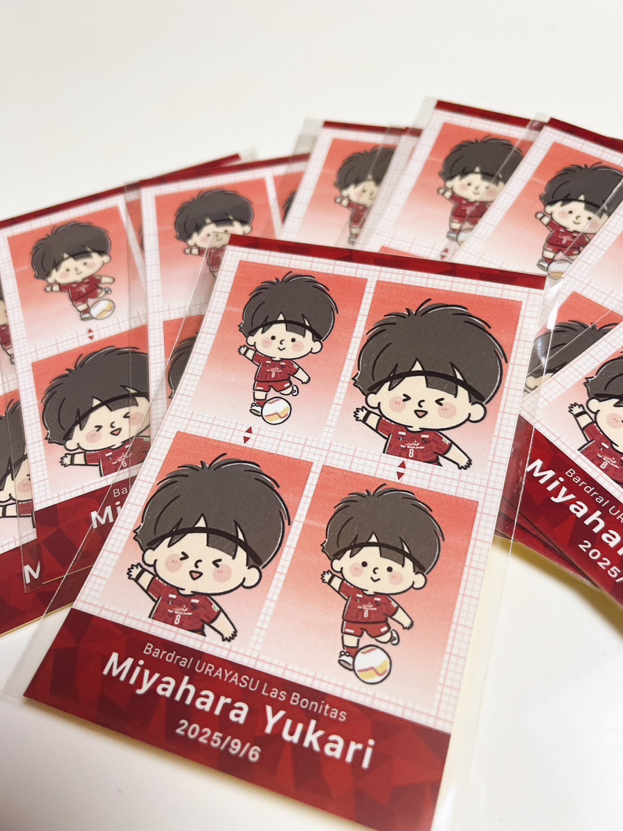 地域の子供たちを試合に招待るフットサルイベントの来場者プレゼントとして、宮原ゆかり選手の照明写真風ステッカーを作成しました。