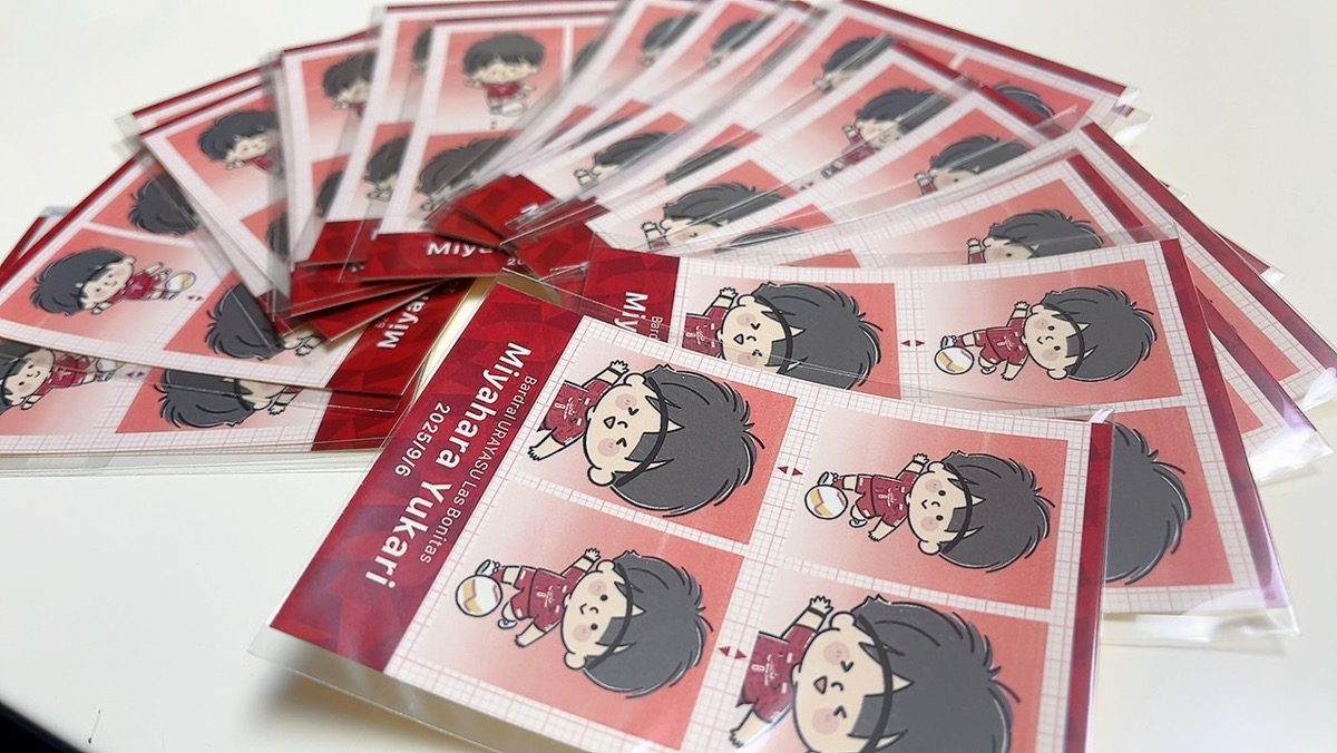 地域の子供たちを試合に招待るフットサルイベントの来場者プレゼントとして、宮原ゆかり選手の照明写真風ステッカーを作成しました。
