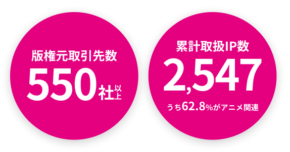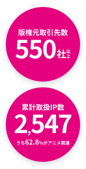 550社以上の版権元と取引実績があり、メガIPからニッチIPまで幅広く権利を獲得することが可能です。