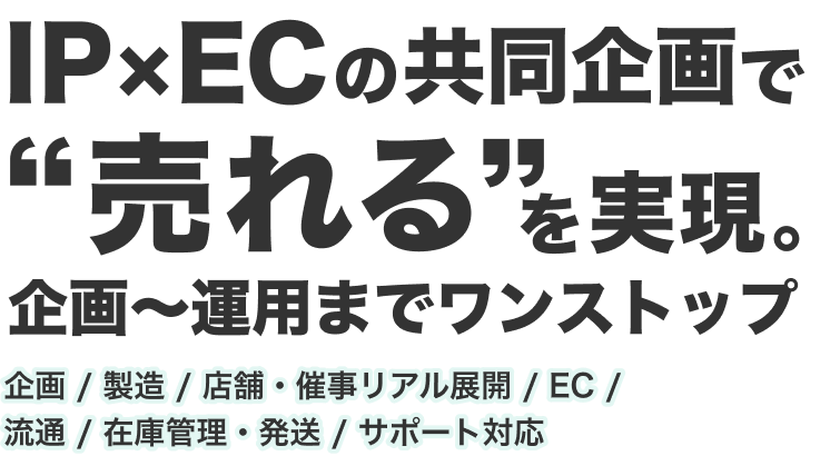 IPの魅力を最大化させるグッズ販売の仕掛ける「企画・製造・在庫管理・発送・流通・店舗展開・CS対応」までワンストップサービス提供。